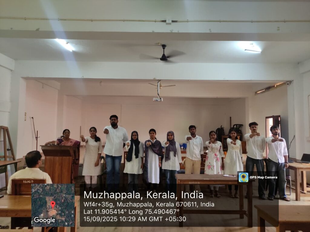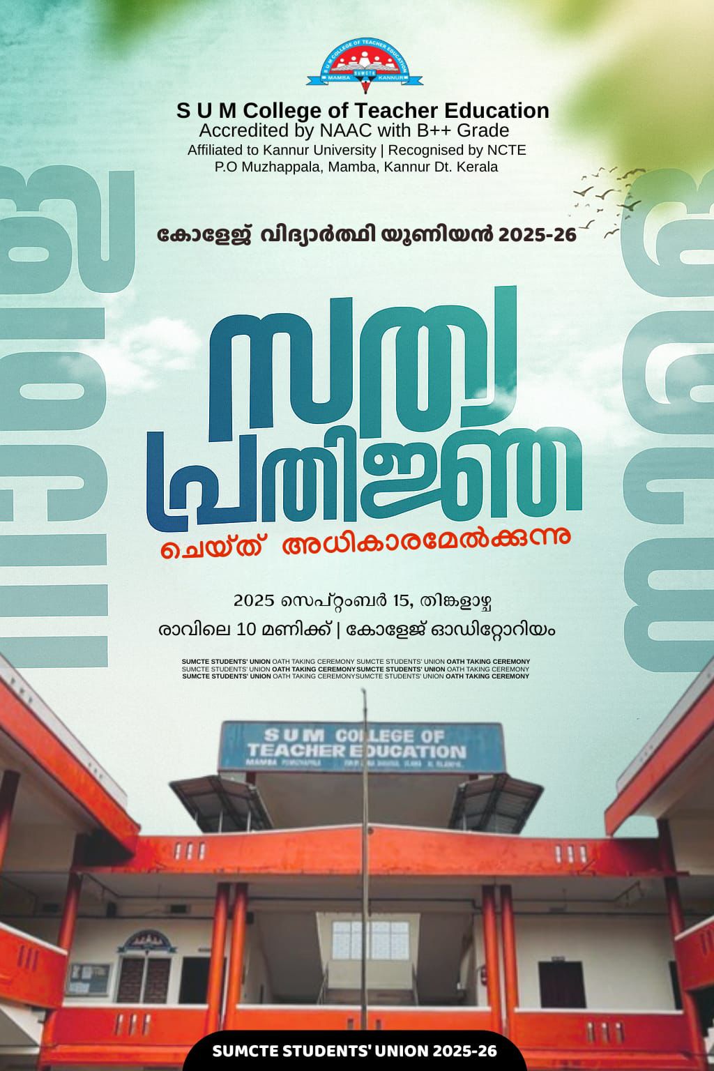 On September 15, 2025, the S.U.M. College of Teacher Education, located in Muzhappala, Kannur, hosted the official oath-taking ceremony for its newly elected Students’ Union for the academic year 2025-26. The event took place at 10:00 a.m. in the college auditorium.