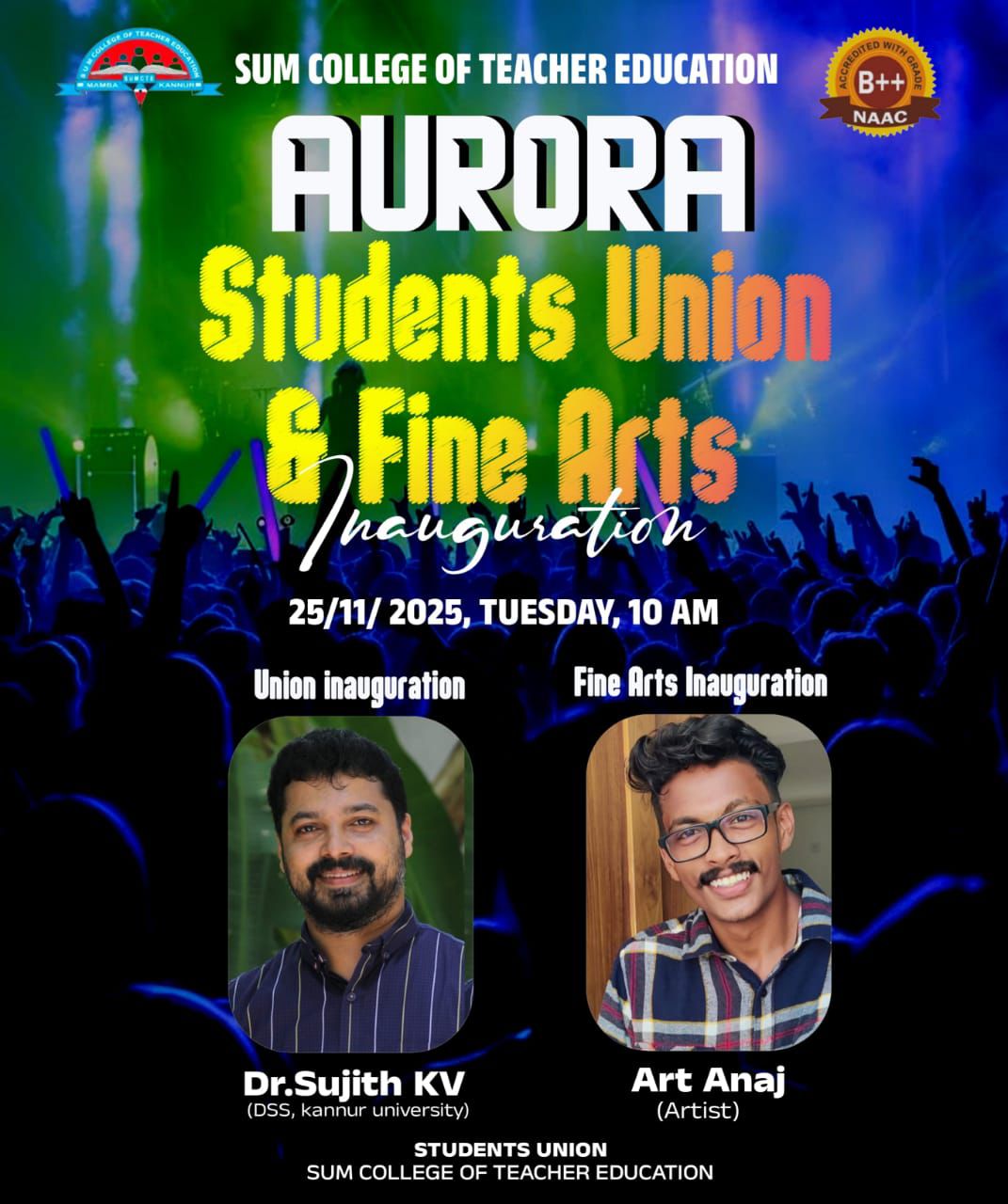 The College Union and Fine Arts Association, Aurora, was inaugurated on 25 November 2025. The Union inauguration was conducted by Dr. Sujith K.V., Director of Student Services, Kannur University, and the Fine Arts Association inauguration was carried out by Mr. Anaj, Sand Artist.