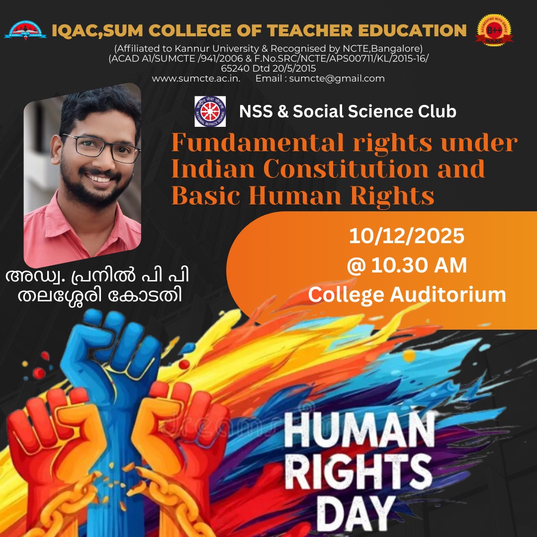 Human Rights Day was observed on 10 December 2025 with an insightful session organized for the students. The keynote talk was delivered by Adv. Pranil P. P., Thalassery Sub Court, on the topic “Fundamental Rights under the Indian Constitution and Basic Human Rights.”